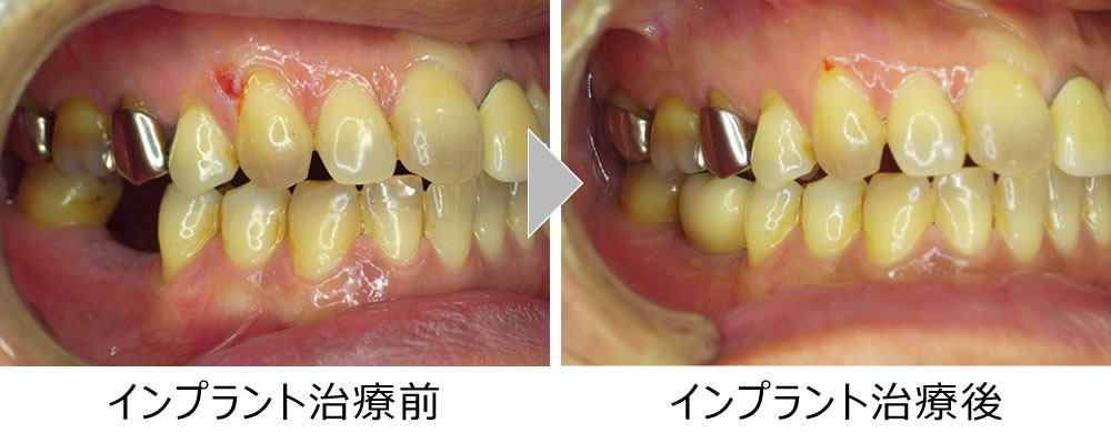 インプラントと顎骨が結合するまで待機した後、歯型を採取して最終的な上部構造(人工歯)を作製します。そして完成した上部構造をお口に装着して治療完了です。インプラント治療前後の写真はこちらです。