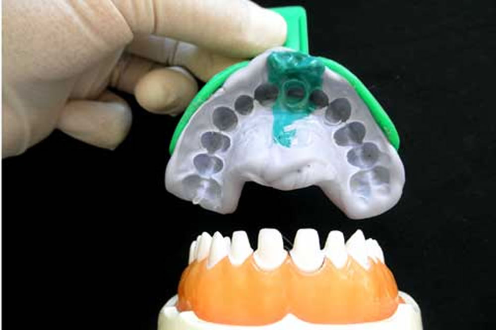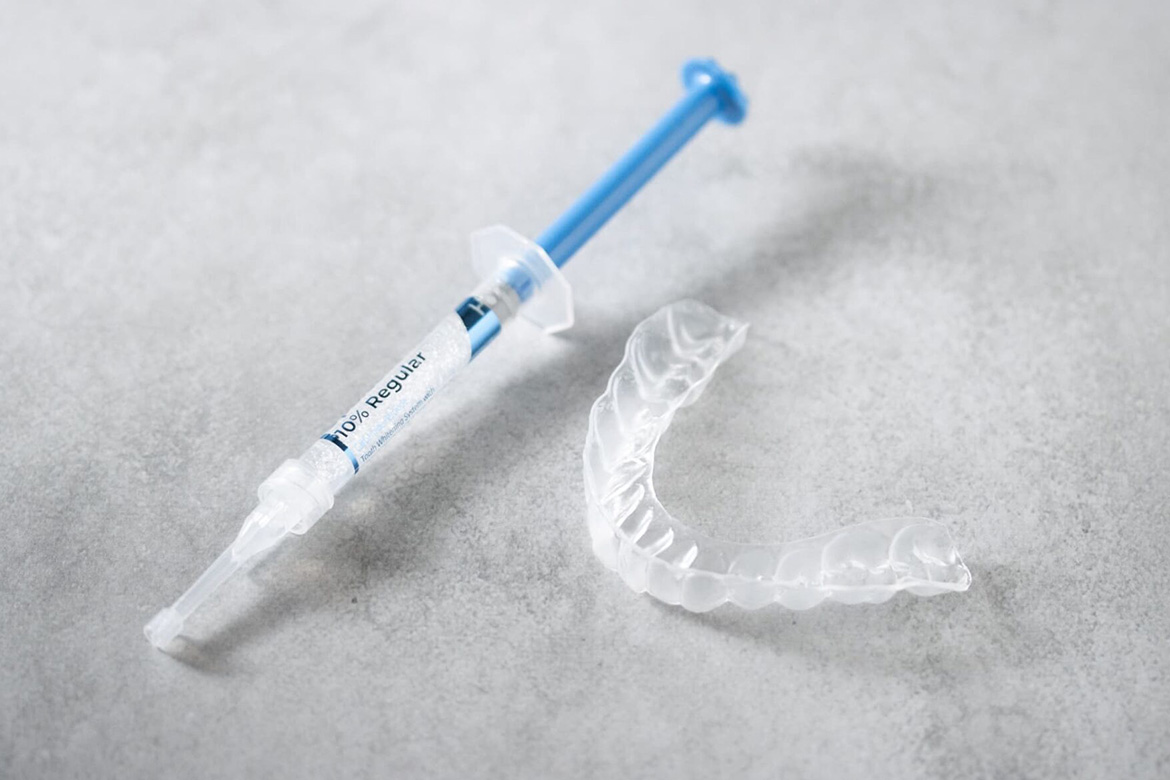 作製したマウスピースに歯の漂白ジェルをセットし装着します。全体にジェルがいき渡っている事を確認した後、およそ2時間から8時間を目安に漂白を行い時間が経ちましたら、マウスピースを外して漂白ジェルを流します。この方法でまずは2週間治療を行って頂きます。