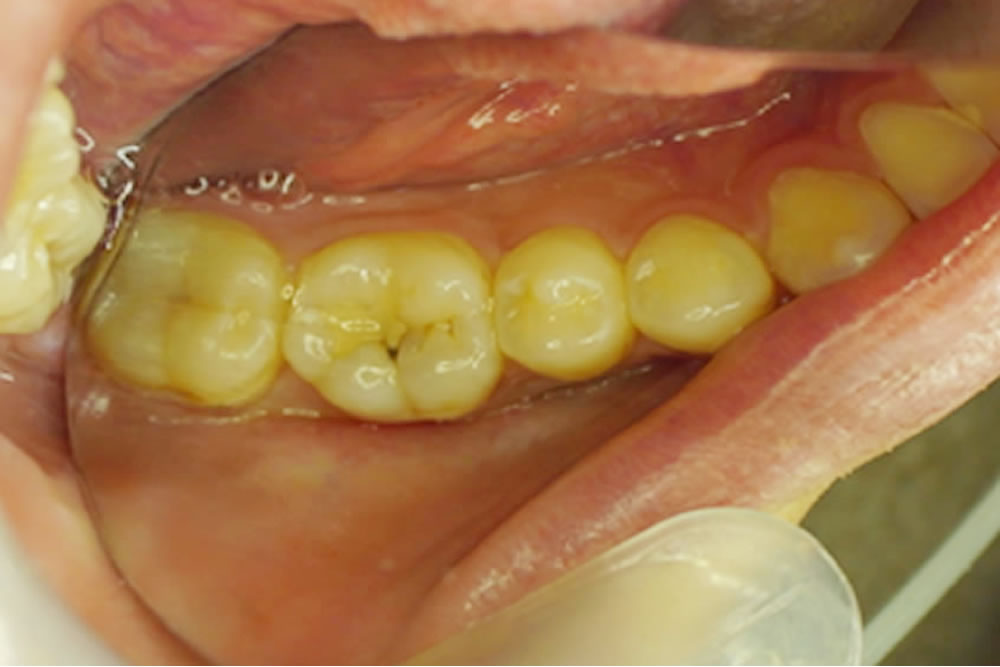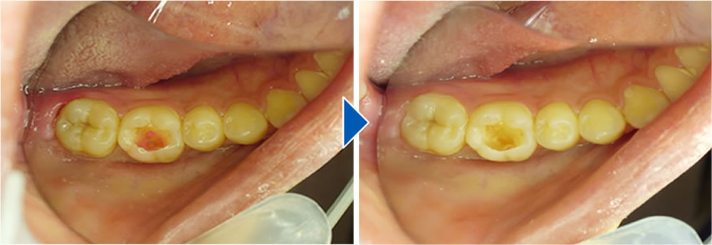 う蝕検知液(むし歯を染めて見えやすくする薬剤)を使用して、むし歯を確実に取り除きました。舌側に及ぶ深いむし歯も丁寧に処置しました。