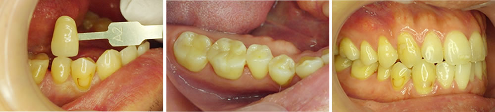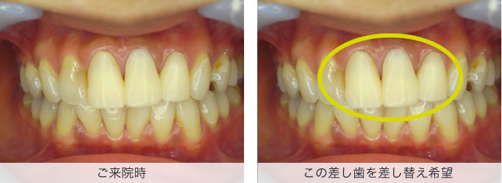 以前、他の歯科医院にて上顎前歯3本を差し歯にしましたが、見た目が人工的すぎるとこのこと、当院にてやりかえたいとのことで、審美性の高いものを要求されました。