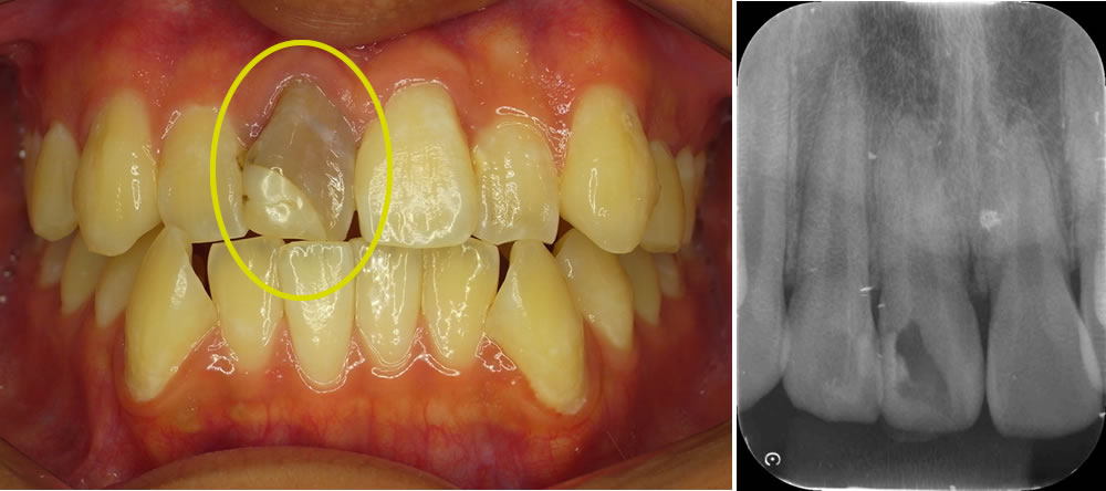 歯髄(歯の神経)が腐って色が変色したことが疑われたので、レントゲンを撮影しました。欠けた範囲が神経まで到達しており、電気を流して反応を診る電気歯髄診で歯髄(歯の神経)に反応がなかったため、神経が死んでいると判断し、根管治療(歯の根の治療)をしてクラウン補綴治療(被せ物)をすることになりました。