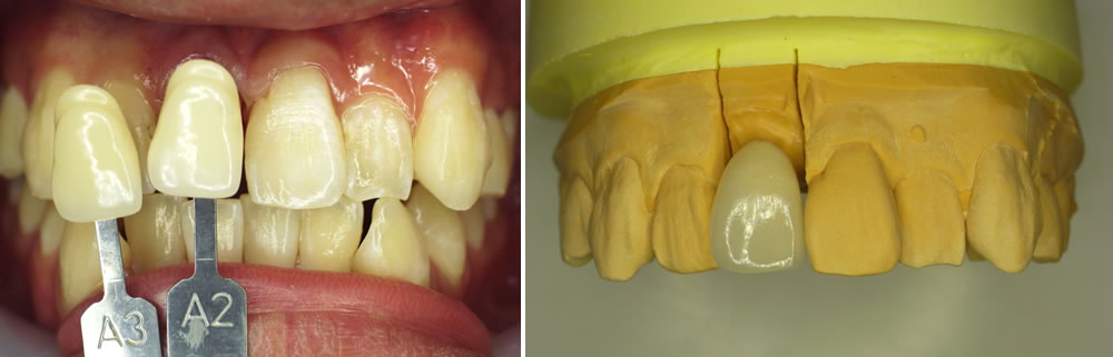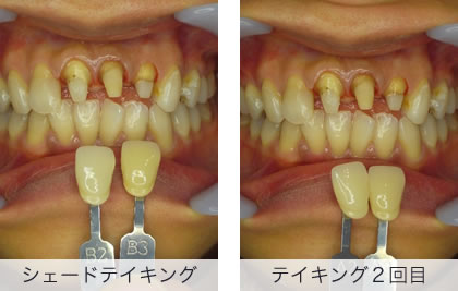 現在のかぶせものを外し、歯肉の治療をして歯肉の状態を整えてから、シェードテイキング(色合せ)を行います。