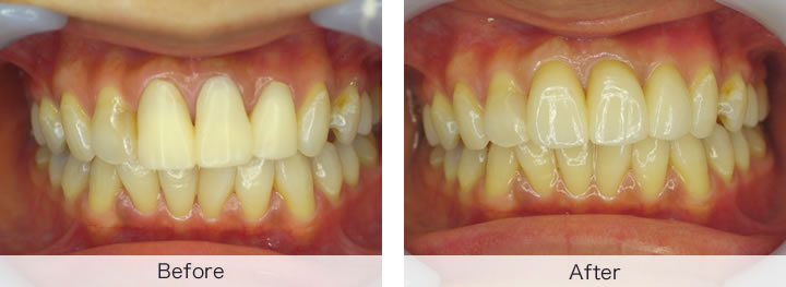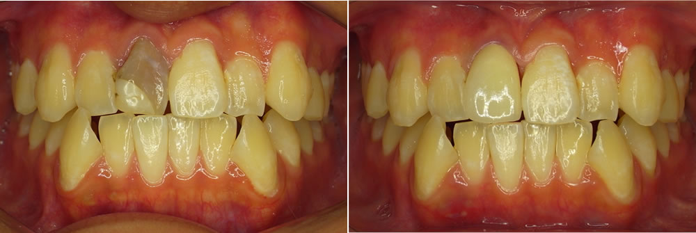 スタンダードメタルボンドセラミッククラウン(ハイクオリティプランもございますが、今回はスタンダードです。)装着前と後の比較写真です。