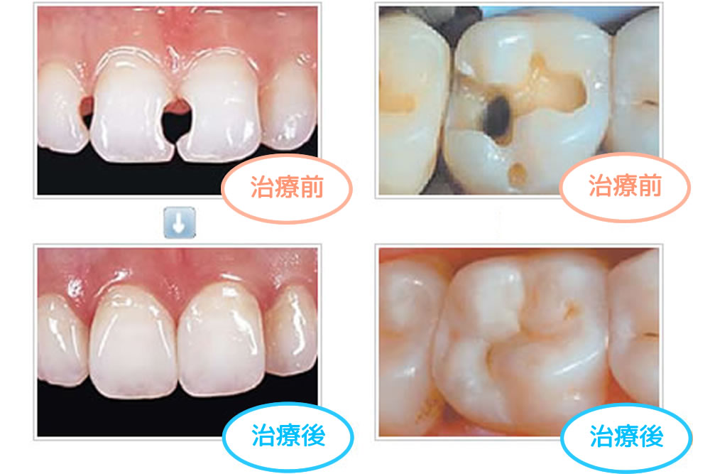 プラスチックのつめ物により1回の治療で完了でき、保険適用内で白く修復する治療が可能になります。ただし、時間が経つとすり減ったり、変色したりする可能性があります。